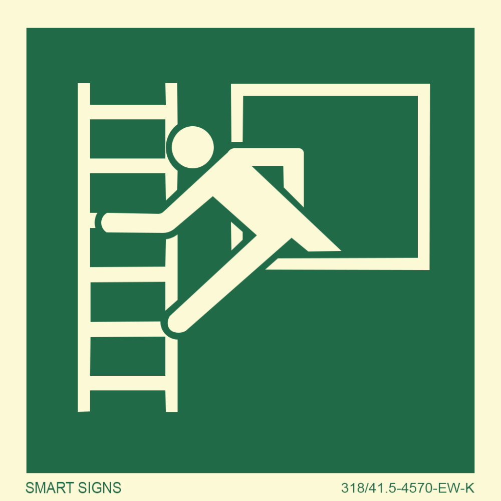 Etterlysende nødskilt med symbol for brannstige med mann under rømning.